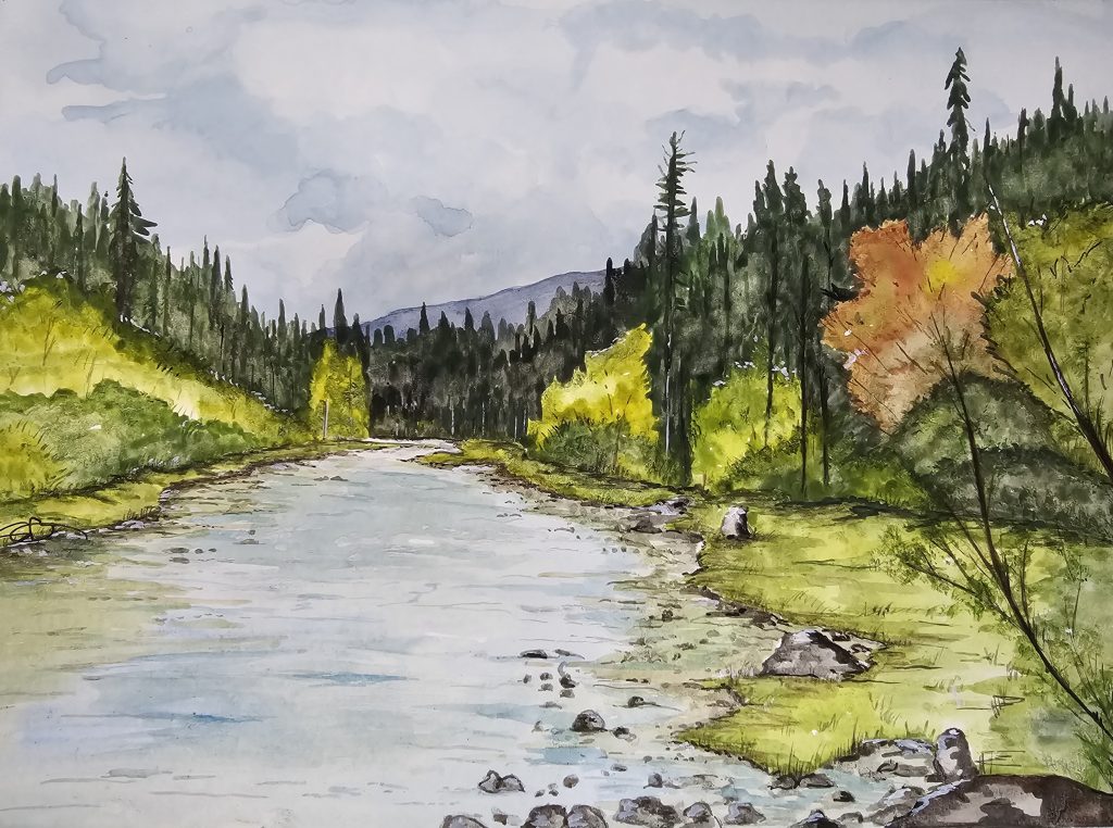Snow capped mountains overlook the stunning and quaint area of Darby, Montana. The evergreens still green yet the ground has turned a warm and vibrant orange.